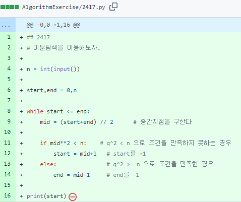 n보다 크거나 같은 최솟값이므로 그 대우는 n보다 작고 같지않은 경우. mid**2 < n을 조건으로 한다.
